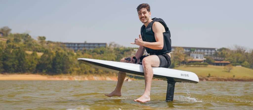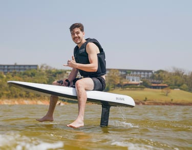 Wings personalizáveis da prancha e-foil Rise oferecem estabilidade para iniciantes e alta performance para experientes, adaptando-se a diferentes estilos e condições aquáticas.
